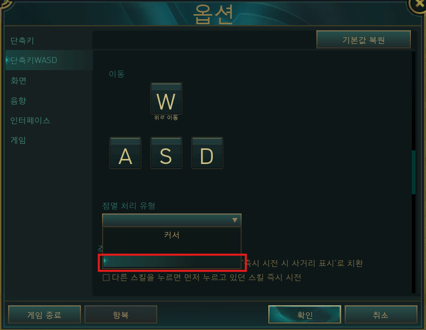 전체적인 세팅 얘기는 여기까지 하고, wasd 로 하기 좋은 챔프다! 싶은 느낌은 아래와 같다.