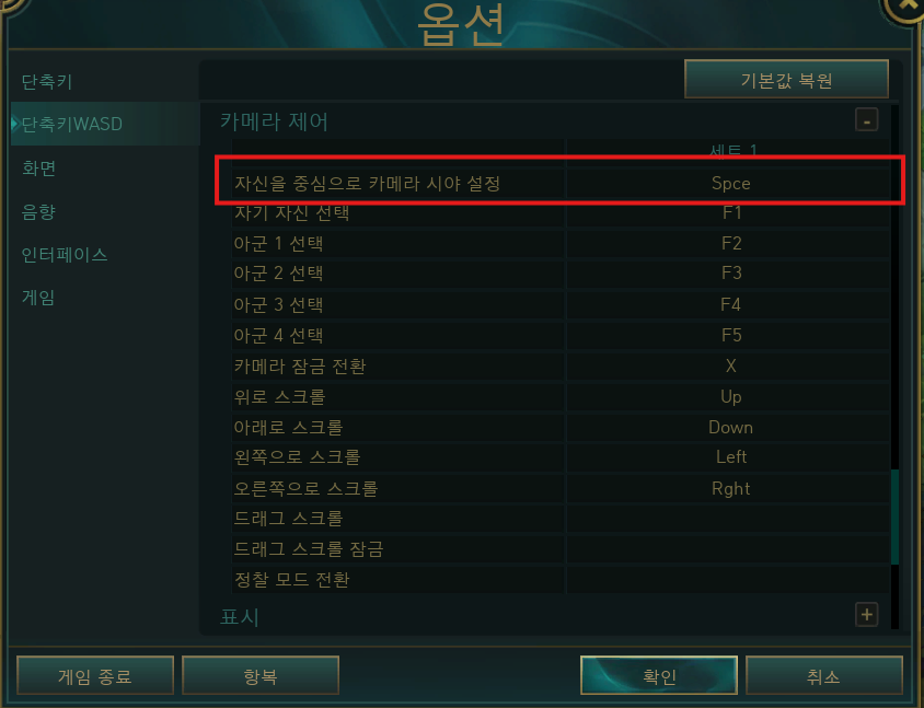 참고로 내 캐릭만 보도록 카메라 고정하는 키도 바뀌어있다. 기본 설정으로 스페이스가 다른 곳에 설정되어있기 때문이다.