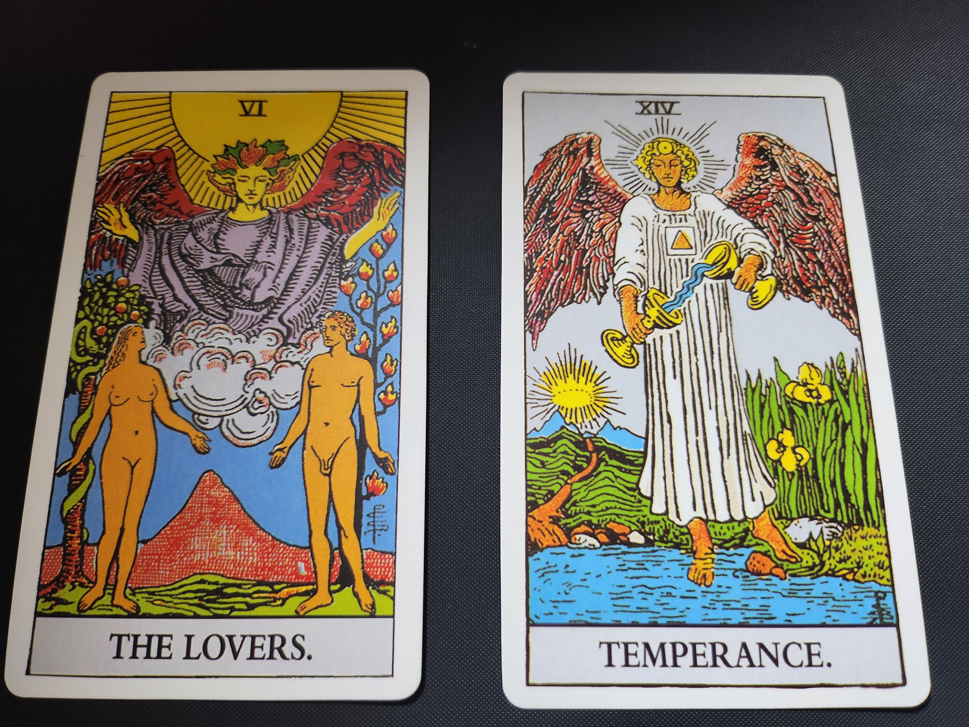 마음이 통하는 "즐거움"을 표현한다. 어떻게 보면 연인 간 근본적인, 에덴에서의 최초로 "쾌락"을 나타내는 카드이다. 단순히 즐거운 상황, 안락한 환경, 서로 좋아하는 마음, 어딘가에 푹 빠짐, 오감이 충족됨, 걱정이 사라짐 등의 해석이 가능하다. 다만 앞을 보지 못할 수도 있는, 무방비 상태를 나타낼 수도 있는 만큼 주의가 필요하다. 다른 해석으로는 금단의 열매를 스스로 선택하는, 자신의 미래를 직접 선택하는 해석도 가능하다.