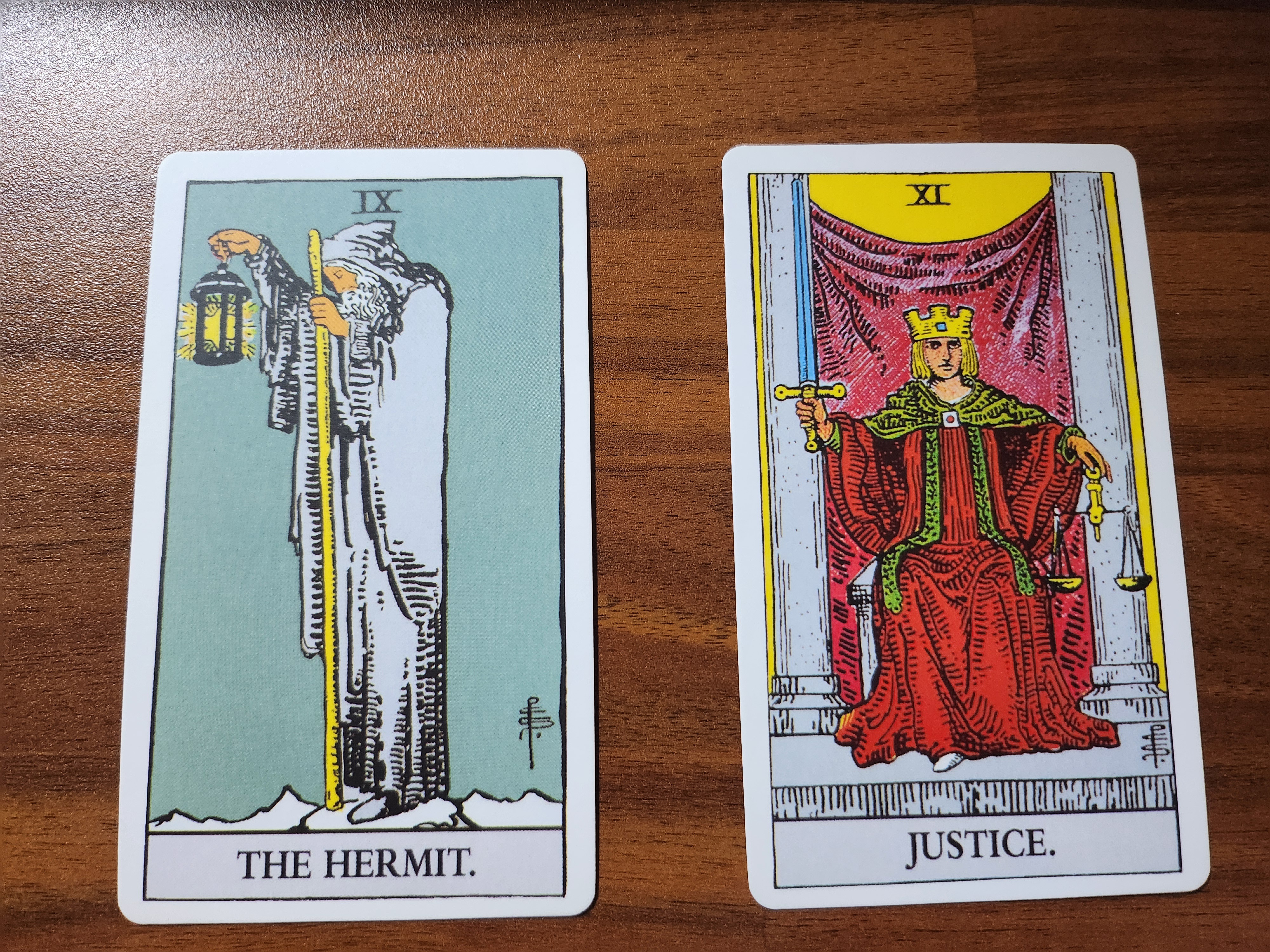 냉정하게 심판을 내리는 모습은 세상에 정면으로 맞서는 것으로 그려지고 있다. 균형을 키워드로 갖고, 감정이 개입하지 않은 냉정한 대처, 옳고 그름만을 기준으로 판단, 현실과 맞서고, 유리한 방향으로 풀어나가는 등으로 해석 가능하다. 감정보다는 사실에 근거해서 모든 것을 판단하는게 좋다.